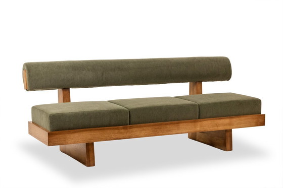 Banco de tres plazas en fresno claro, tapizado en terciopelo mohair verde. El asiento consta de tres cojines en una caja y el respaldo es cilíndrico. Fabricado artesanalmente en Italia en una pequeña serie. Estilo contemporáneo.