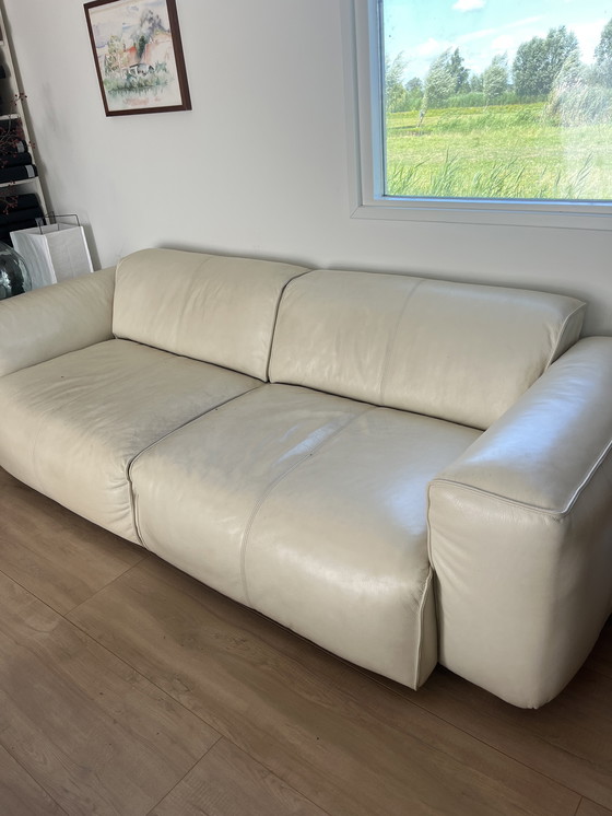 Moderno sofá de tres plazas de Hudson Copenhagen, tapizado en piel color crema de alta calidad. Presenta un diseño elegante y contemporáneo, perfecto para un salón con estilo. El sofá ofrece cómodos asientos con sus cojines de felpa y amplios reposabrazos, por lo que es una opción ideal para relajarse y reuniones sociales.