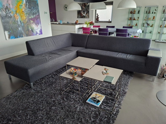 El sofá consta de un sofá de 3 plazas con un brazo a la derecha (dimensiones 206x83x81 cm) y una chaise longue XL con brazo a la izquierda (dimensiones 87x81x240 cm). Incluye un elegante reposabrazos de acero inoxidable. El sofá se entrega usado con una pequeña zona dañada (aproximadamente 6x6 cm).