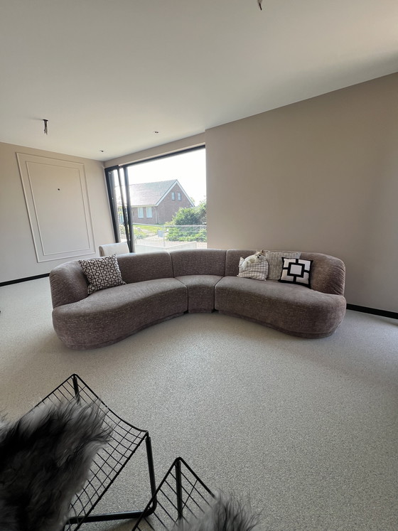 Precioso sofá esquinero redondo con un diseño único. Está tapizado en una tela suave de un color delicado. Es muy cómodo y se encuentra en muy buen estado. ¡Una pieza única y hermosa! Destaca por la combinación de su forma, material y color.