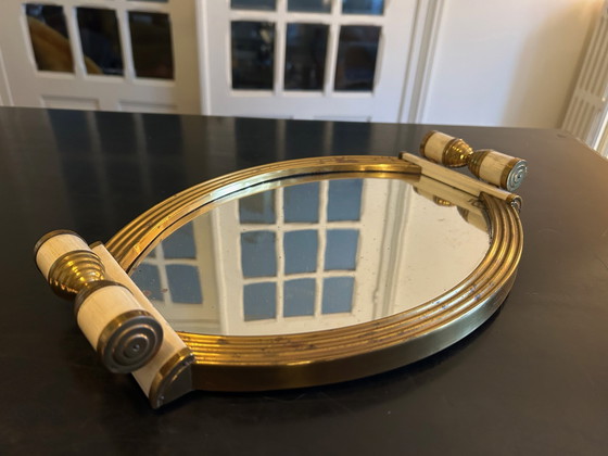 Bandeja Art Decó con base de espejo y asas de madera pintada, borde de latón.