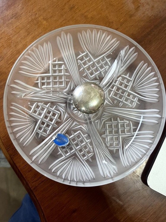 Esta bandeja de aperitivos de cristal de tres compartimentos cuenta con un asa de plata de ley. Presenta un diseño clásico con tallas decorativas en el cristal y un asa central para facilitar su transporte. Ideal para servir aperitivos, snacks o postres pequeños de forma organizada y elegante.