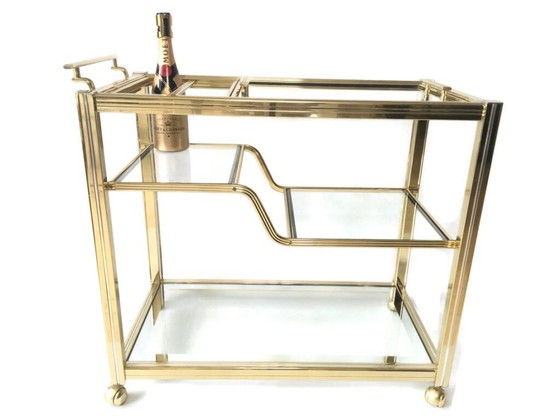 - Fabricado con una impresionante estructura de latón, este carrito de bar brilla con un tono dorado, complementado por elegantes estantes de cristal que ofrecen funcionalidad y atractivo estético.