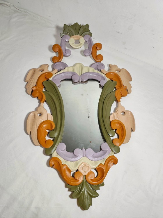 Este exquisito espejo de madera, originario de España en la década de 1950, es una pieza única que captura la esencia del estilo barroco. Su marco está adornado con intrincados detalles en tonos verdes, naranjas y púrpuras, que aportan un toque de elegancia y sofisticación a cualquier espacio.