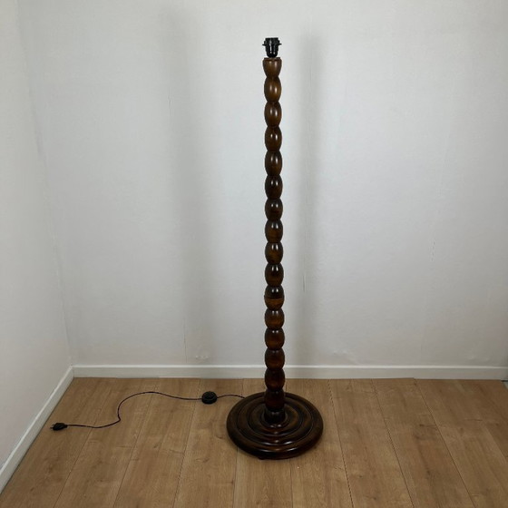 Base de lámpara de pie de madera torneada, 1980. ¡Añade la pantalla que mejor se adapta a tu decoración! Dimensiones: Base: diámetro 39 cm. Altura: 143 cm. Sistema eléctrico europeo correcto, bombilla E27 no incluida. Muy buen estado general, artículo vintage, conserva las huellas del tiempo. Ver fotos.