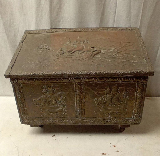Este baúl de latón antiguo es una encantadora pieza de época, perfecta para añadir un toque de historia a su hogar. Presenta intrincados grabados de barcos en el exterior y un vibrante estampado floral en el interior. El baúl está fabricado en latón con elementos de madera, lo que le confiere durabilidad y atractivo estético. Ideal para guardar recuerdos o como elemento decorativo.
