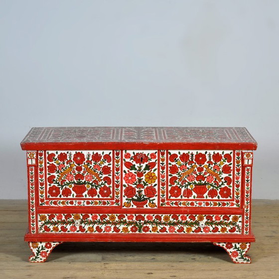 Este cofre vintage de pino de mediados del siglo XX es realmente llamativo. Está ricamente decorado con motivos folclóricos pintados a mano, en una paleta de colores tradicional de cálidos rojos y verdes, con sutiles toques de amarillo.