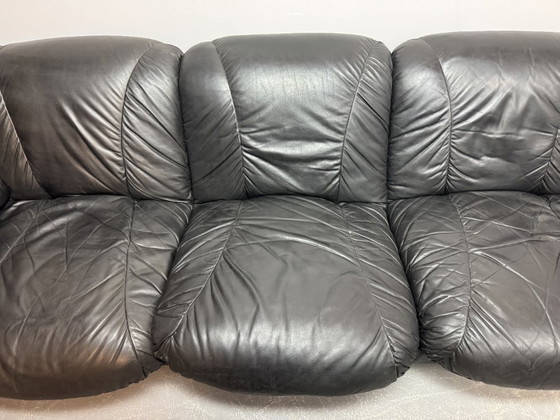 Beautiful Big Black Leather Postmodern Italian Design Space Age 3-Seat Lounge Sofa with Brass Buttons and Playful Cord Lacing