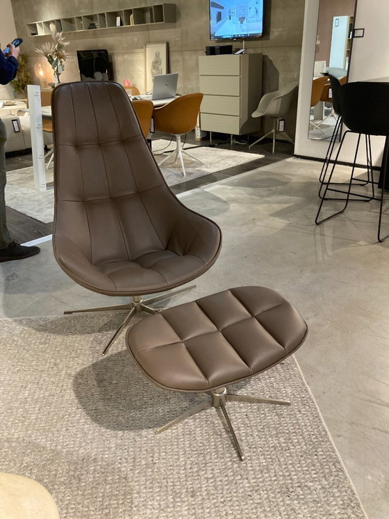 Sillón giratorio con reposapiés giratorio Patas/base: Acero cepillado 0094 Tapizado: Piel Nordic Grain color piedra 5131 Sillón: Alto: 113 cm x Ancho: 79 cm x Largo: 91 cm Reposapiés: Alto: 37 cm x Ancho: 65 cm x Largo: 44 cm