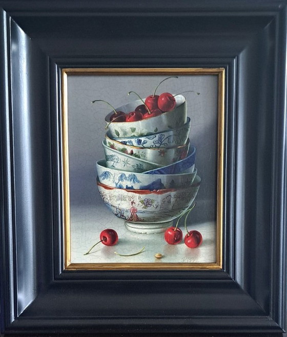 Esta atractiva obra es de Rob Ritchie, artista residente en Londres. Representa cuencos apilados con cerezas dentro y alrededor. Mide 43 x 38 cm. El marco está hecho a mano con un borde dorado. El artista es de renombre internacional y trabaja frecuentemente por encargo, así como en pintura al óleo y oleografía, como es el caso de esta obra.