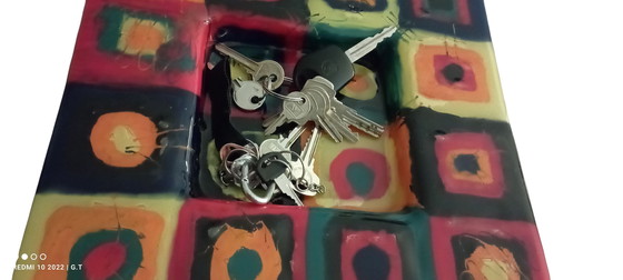 Esta bandeja de cristal de Murano, firmada por un artista, es una pieza de arte única que añadirá un toque de elegancia y color a su espacio. Su vibrante paleta de colores y su diseño geométrico la convierten en un elemento distintivo y cautivador para cualquier ambiente.