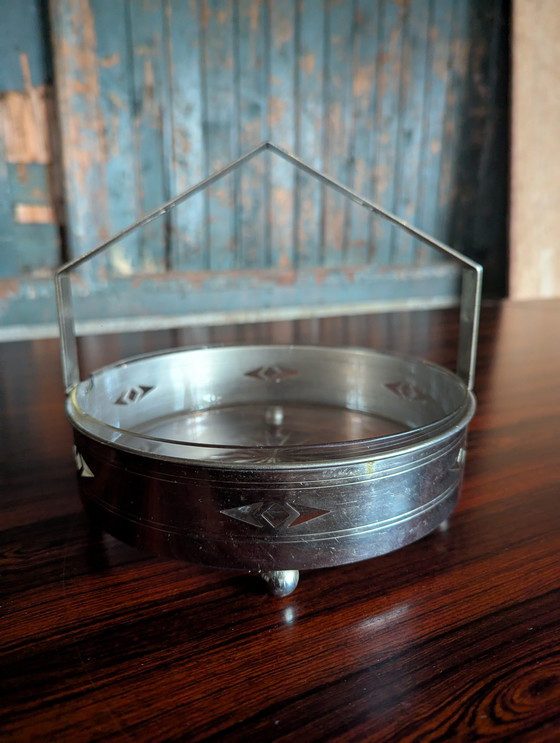 La bombonera cuenta con una bandeja de metal plateado de bella factura y un cuenco de cristal en su interior. El cuenco de cristal presenta una pequeña muesca detrás del asa, invisible desde el frente. Ver fotos para más detalles.
