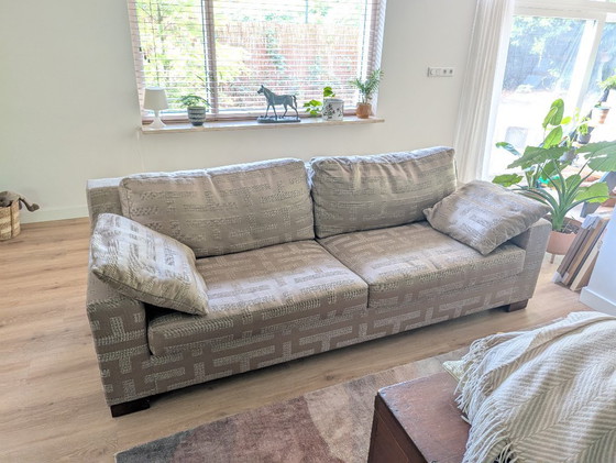 Amplio sofá de dos plazas en beige/marrón con estampado de bloques claros.