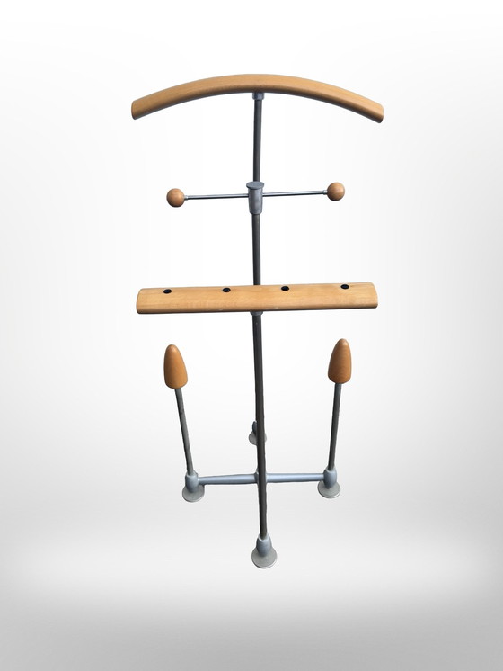 Diseñado por Frans de la Haye y fabricado por Auping en los Países Bajos alrededor de 1990, este hermoso y funcional cambiador "Auronde" es un complemento perfecto para cualquier dormitorio. Con una altura de 94 cm, una anchura de 45 cm y una profundidad de 41 cm, este vestidor ofrece espacio suficiente para colgar la ropa ordenadamente. El diseño combina la elegante madera con el robusto metal, lo que le confiere una construcción elegante y duradera. Ideal para organizar la ropa y los accesorios, este cambiador es práctico y estéticamente agradable.