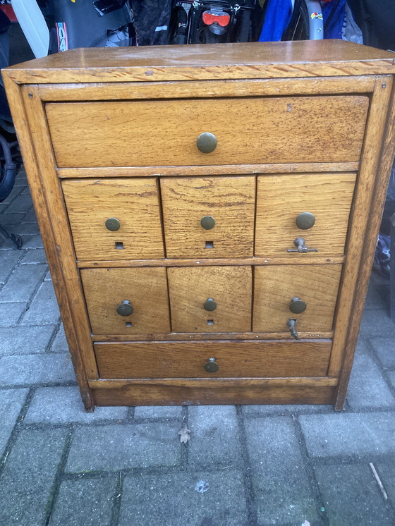 Antiguo botiquín/archivador con dos tiradores originales y preciosos, un puño esculpido a mano y muy detallado. Los cajones funcionan a la perfección.