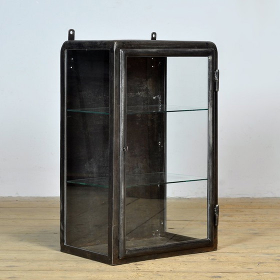 Botiquín de los años 30. Se le ha retirado por completo la pintura original, dejando al descubierto el metal. Posteriormente, se pulió, logrando un aspecto robusto y desgastado con un sutil brillo. Se ha conservado el diseño original con puerta de cristal y estantes, lo que lo convierte en un mueble no solo decorativo, sino también práctico. Ideal para el baño, la cocina o como elemento decorativo de estilo industrial en el salón. Incluye la cerradura y la llave originales.