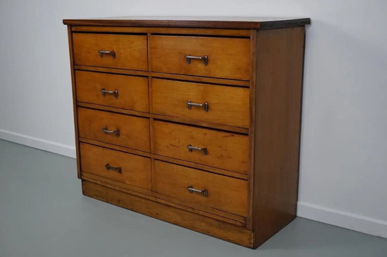 Este botiquín se fabricó en los Países Bajos alrededor de la década de 1950. Se utilizaba en una escuela para guardar material de arte. Cuenta con ocho cajones grandes con tiradores metálicos de estilo industrial.