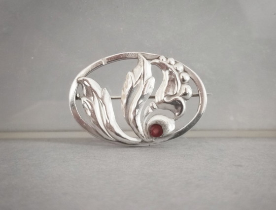 Broche de plata Bernhard Hertz, estilo Art Nouveau/Art Déco, con piedra de ágata roja. Copenhague, Dinamarca, 1910. 5,5 gramos, 42 x 30 mm, con marcas de contraste y sello de plata 825S. Envío en la UE: 25 €.