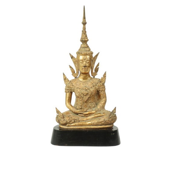 Fantástico Buda de bronce estilo Rattanakosin montado sobre una base de madera lacada en negro, este es el Buda Dhyana mudra, el Buda meditador, este objeto es de Tailandia, circa 1900.