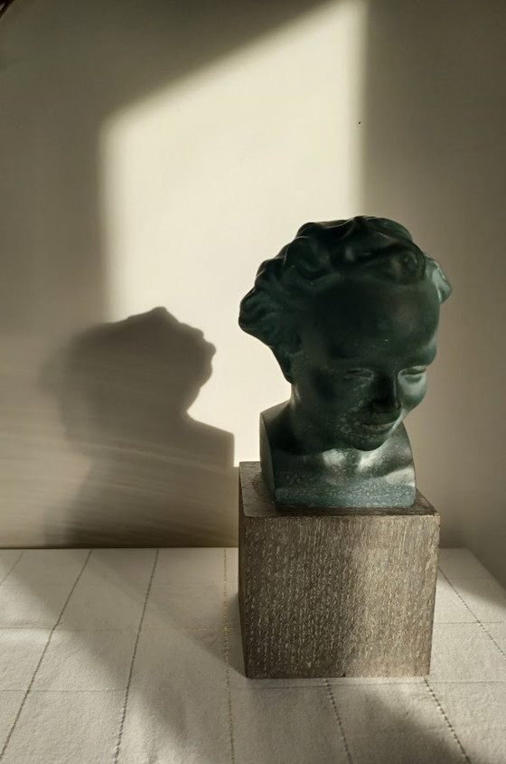 Busto de yeso de un niño - entreguerras/1950 - pátina verde - base de madera