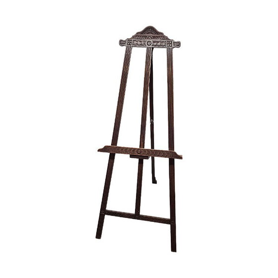 Caballete antiguo de roble de finales del siglo XIX. Este encantador y decorativo caballete está hecho de roble y presenta tallas. El soporte fue restaurado y le falta un pequeño bloque de la pata trasera.