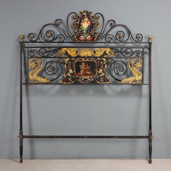 Cabecero de hierro lacado en negro. La elaboración rizada se alterna con inserciones de chapa metálica perforada, grabada y dorada que representan dragones y una concha central. Dos paneles de chapa metálica pintada con querubines y un jarrón de flores se sitúan en el centro. Italia, siglo XIX.