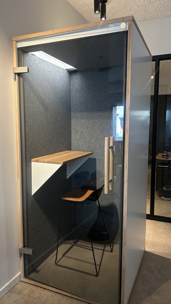 Cabina telefónica individual para oficina con: - Iluminación LED controlada por sensores: optimizada para videollamadas - Ventilación silenciosa: intercambio de aire silencioso cada 60 segundos - Toma de corriente de 230 V: para sus dispositivos, si la reunión se alarga un poco más - Paredes dobles insonorizantes: máximo aislamiento acústico gracias a un robusto sistema de doble pared