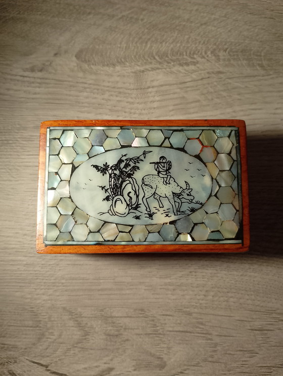 Caja de erudito antigua de madera con decoración de nácar que representa a un niño con un búfalo, Indochina china.