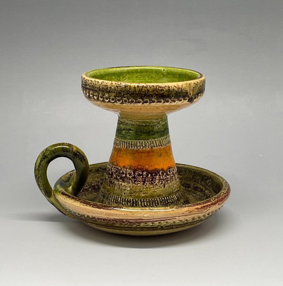 Informe de estado: La pieza se encuentra en excelente estado vintage. No presenta desconchones, grietas ni reparaciones. El esmaltado tiene un brillo precioso. En el interior del candelabro se aprecian mínimos residuos de cera propios del paso del tiempo que no afectan a su función. (Nota sobre la autenticidad: Como muchas piezas de exportación de este período, el objeto no presenta marcas en la base, pero, a juzgar por su forma, decoración y esmaltado, se puede atribuir sin duda a Bitossi).