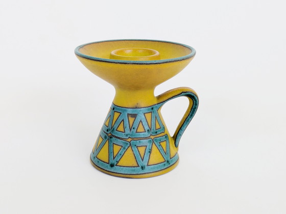 Candelabro de cerámica de mediados de siglo del alfarero de Alemania Occidental Ceramano, modelo 401. Este candelabro de mano presenta la decoración "Limone", con un rico esmaltado amarillo limón y un vibrante patrón geométrico turquesa. Bellamente elaborado y firmado en la parte inferior, esta pieza es un magnífico ejemplo del encanto atemporal de la cerámica de Alemania Occidental. Su forma modernista y sus vibrantes colores lo hacen perfecto como centro de mesa, elemento decorativo para la repisa de la chimenea o como regalo para los amantes del diseño vintage o ecléctico. Dimensiones: Alto: 9,5 cm Diámetro: 9,5 cm Estado: Excelente estado vintage con mínimas señales de uso. Firmado en la parte inferior. Ver fotos para más detalles.