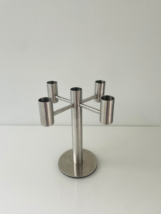 Candelabro de cinco brazos fabricado en acero inoxidable cepillado, con un diseño limpio y moderno. La estructura consta de una columna central con cinco brazos uniformemente espaciados, lo que crea una forma definida y una presencia imponente.