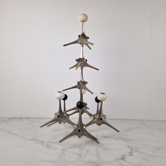 Impresionante candelabro modular, muy coleccionable, diseñado por Caesar Stoffi y Fritz Nagel, Alemania, alrededor de la década de 1960. Realizado en metal plateado pulido con originales candelabros esféricos en blanco y negro, esta pieza es un célebre ejemplo del diseño escultórico moderno de mediados de siglo.