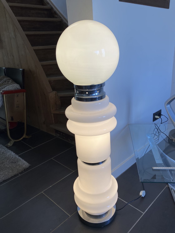 Ilumina tu espacio con la sofisticada elegancia de esta lámpara de pie Carlo Nason para Mazzega. Un ejemplo impactante del diseño moderno de mediados de siglo, esta lámpara combina armoniosamente vidrio blanco y elegante metal, creando una estética atemporal que complementa cualquier interior.