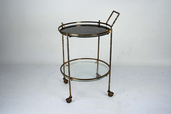 Carrito de bar redondo de mediados de siglo, de latón y cristal con efecto mármol. Italia, década de 1950.