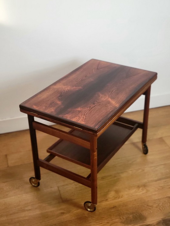 Precioso carrito danés, diseñado por Kurt Østervig para Jason Møbler, fabricado en noble palisandro. Este excepcional carrito multifuncional es extensible y plegable, lo que le permite adaptarse fácilmente a diversas funciones: carrito de servicio, mesa auxiliar o mesa de comedor compacta. El estante inferior extraíble también puede usarse como bandeja.