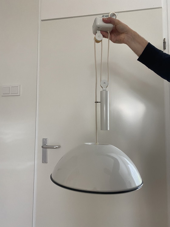 Esta es una lámpara Relemme de Flos Castiglioni, una pieza clásica del diseño italiano. La lámpara presenta un elegante acabado en metal blanco y un característico sistema de poleas para ajustar la altura. Es perfecta para añadir un toque de elegancia a cualquier habitación. La lámpara se encuentra en muy buen estado, con sólo pequeños arañazos, manteniendo su atractivo estético y su funcionalidad.