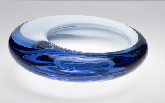 Un hermoso cenicero de la serie Akva del fabricante danés de vidrio Holmegaard, diseñado por Per Lütken y con formas maravillosamente curvas. La serie Akva tuvo un gran éxito y fue producida por Holmegaard entre 1953 y 1974.