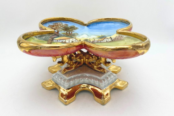La decoración de porcelana esmaltada del centro de mesa procede de Europa occidental. Buen estado, daños menores visibles en las fotos.