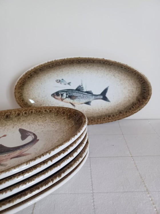Este juego de 6 platos ovalados vintage presenta cada uno un motivo de pez diferente y un hermoso y único borde esmaltado a mano.