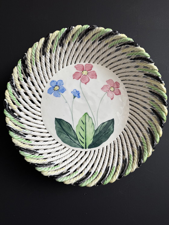 Preciosa cesta frutera de cerámica tejida española de los años 50/60 con un medallón floral central; muy buen estado general (desgaste en el borde: ver foto).
