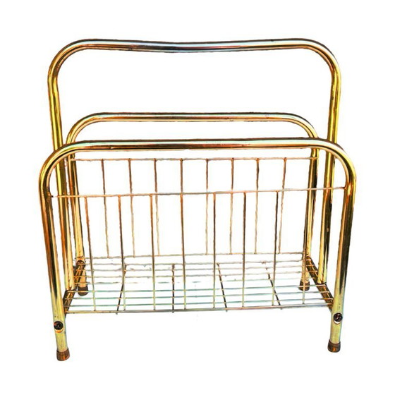 Revistero modernista, Bélgica, década de 1980. Este elegante revistero modernista se fabricó en Bélgica en la década de 1980. Sus tubos metálicos dorados le confieren elegancia y una sensación de luminosidad y amplitud. Su forma sencilla y geométrica lo convierte en el complemento perfecto para el modernismo y el minimalismo, a la vez que es una pieza funcional de decoración vintage. Perfecto para guardar periódicos, revistas o álbumes. Dimensiones: Alto: 39 cm Ancho: 35 cm Fondo: 18 cm Estado: Muy bueno, con signos naturales del paso del tiempo.