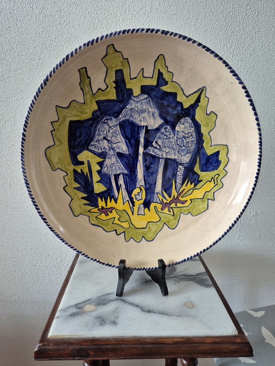 Este hermoso plato de Chris Lanooy, decorado con un intrigante motivo de hongos, es un magnífico ejemplo de cerámica Art Déco. Los vibrantes colores azul y amarillo contrastan a la perfección con el fondo beige, dándole a la pieza un atractivo visual impactante.