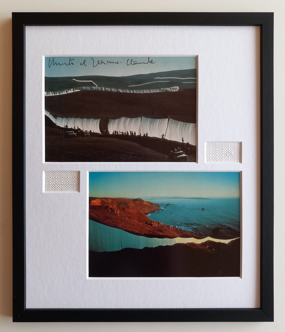 Christo & Jeanne-Claude - Running Fence - tarjeta artística firmada (+1) con 2 piezas de tela originales