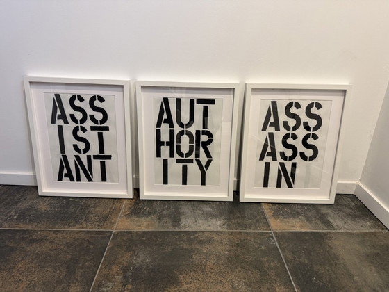 Conjunto de tres litografías enmarcadas, "Libro Negro Dos Veces", de una edición limitada de 350 ejemplares, del artista francés Sébastien Girard, Francia, circa 2024. Estas obras siguen la serie "Libro Negro" de Christopher Wool, producida en 1989. Pertenecen a la larga tradición de un artista que se apropia de la obra de otro, la modifica y la hace suya. En este caso, las obras de Girard presentan las palabras de Wool impresas en ambas caras del papel, creando una imagen especular completamente nueva. Recientemente enmarcadas profesionalmente en marcos blancos nuevos. El precio indicado corresponde al conjunto de tres. Envío seguro por Colissimo.