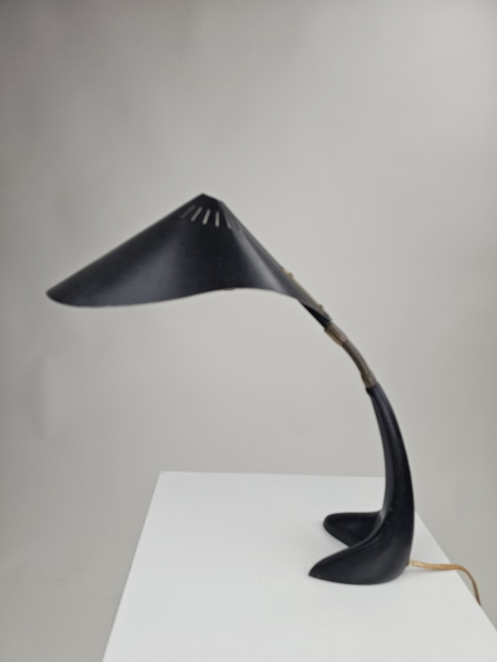 Esta rara lámpara de escritorio Cobra de Cosack Leuchten es un impresionante ejemplo del diseño moderno de mediados de siglo. La lámpara tiene una forma elegante y esbelta que recuerda a una cobra, con un brazo ajustable para una iluminación direccional. El metal negro y los detalles dorados le confieren un aspecto atemporal. Perfecta para los amantes del diseño vintage y el arte funcional.