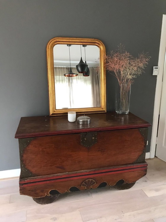 Cofre antiguo javanés original de madera con herrajes de cobre. Traído de Indonesia. ¡Una auténtica joya! 150 x 65 x 87 cm. Bien conservado y en muy buen estado, aunque con algunas señales de uso propias de su antigüedad.