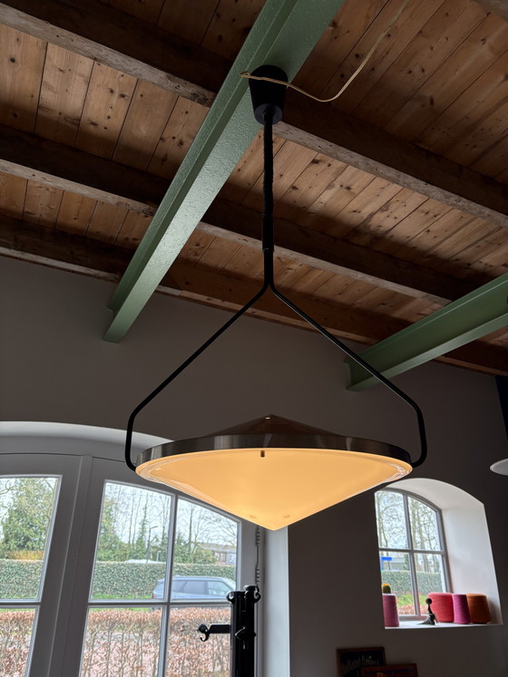 Lámpara colgante vintage de diseño exclusivo, modelo «Kompas» (B-1280), diseñada por B. Lodder para el reconocido fabricante holandés Raak Amsterdam entre 1968 y 1972.