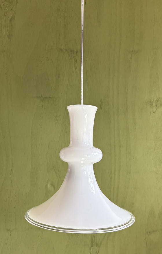 Material: La lámpara está fabricada en vidrio opalino blanco brillante soplado a mano.