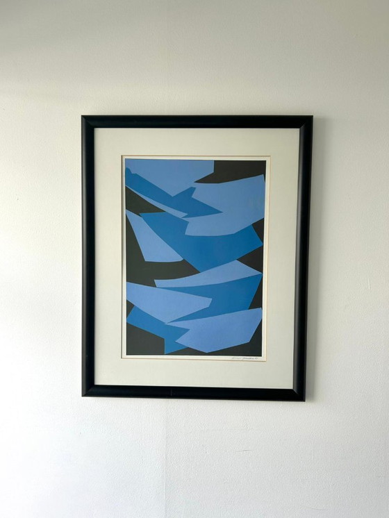 Preciosa obra de arte firmada procedente de Dinamarca, 1991. La firma es bastante difícil de leer, por lo que aún no hemos descubierto al artista. A primera vista, parece una litografía, pero se trata de un collage. La obra tiene formas abstactas y vibrantes tonos azules y negros.
