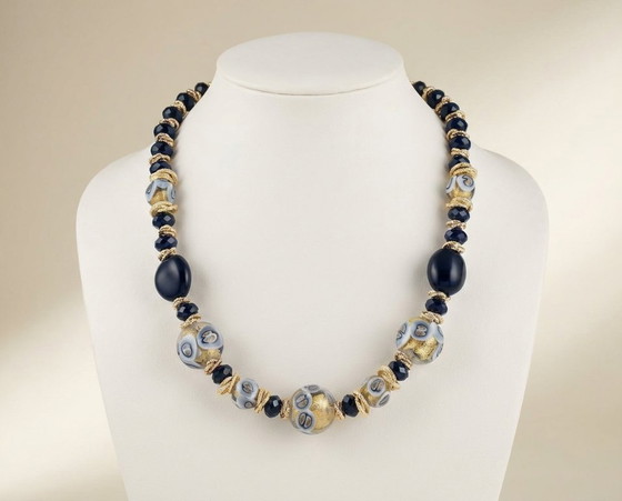 La alternancia de cuentas negras pulidas y cuentas artísticas con insertos de oro le confiere al collar un estilo sofisticado y elegante, perfecto tanto para ocasiones formales como para coleccionistas de joyas artísticas.